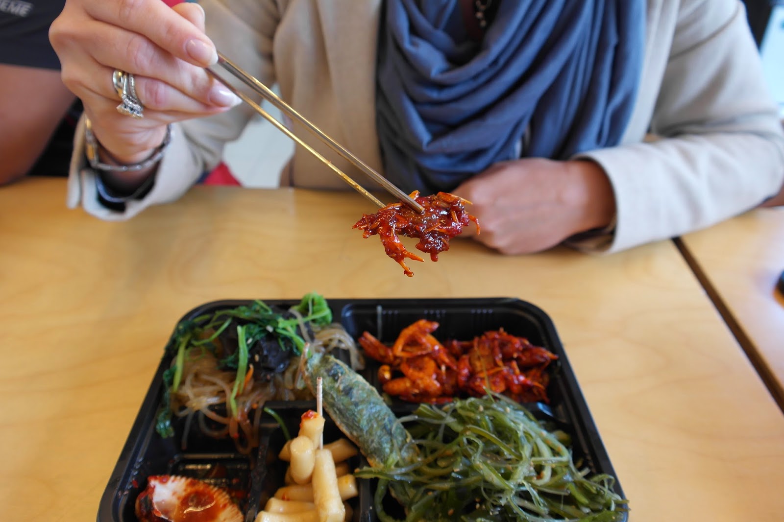 Z kulinarnych dla nas nowinek, Małżonka na przystawkę wybrała karmelizowane na chrupko krabiki i krewetki. Je się to razem z pancerzykiem, wszak chityna niezbędna na stawy.