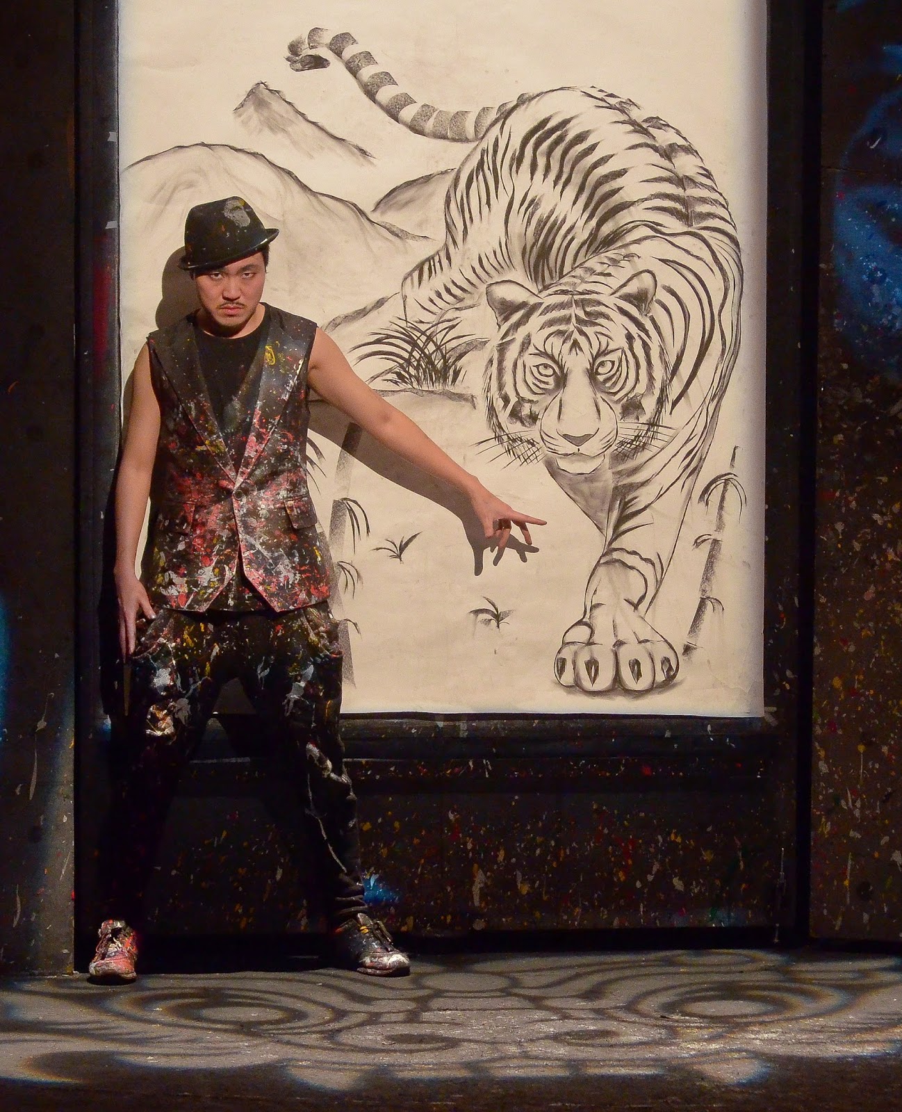 They started with four frames covered in black canvas, diplayed on sturdy easels. Having fun with us and with each other, constantly mocking, they splashed some paint in seemingly meaningless pattern.