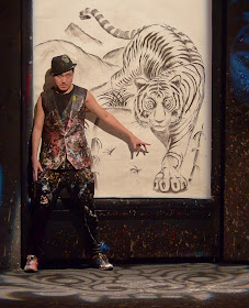 Four guys, wearing black trousers, vests and fedora hats, all liberally splashed with various paints.
