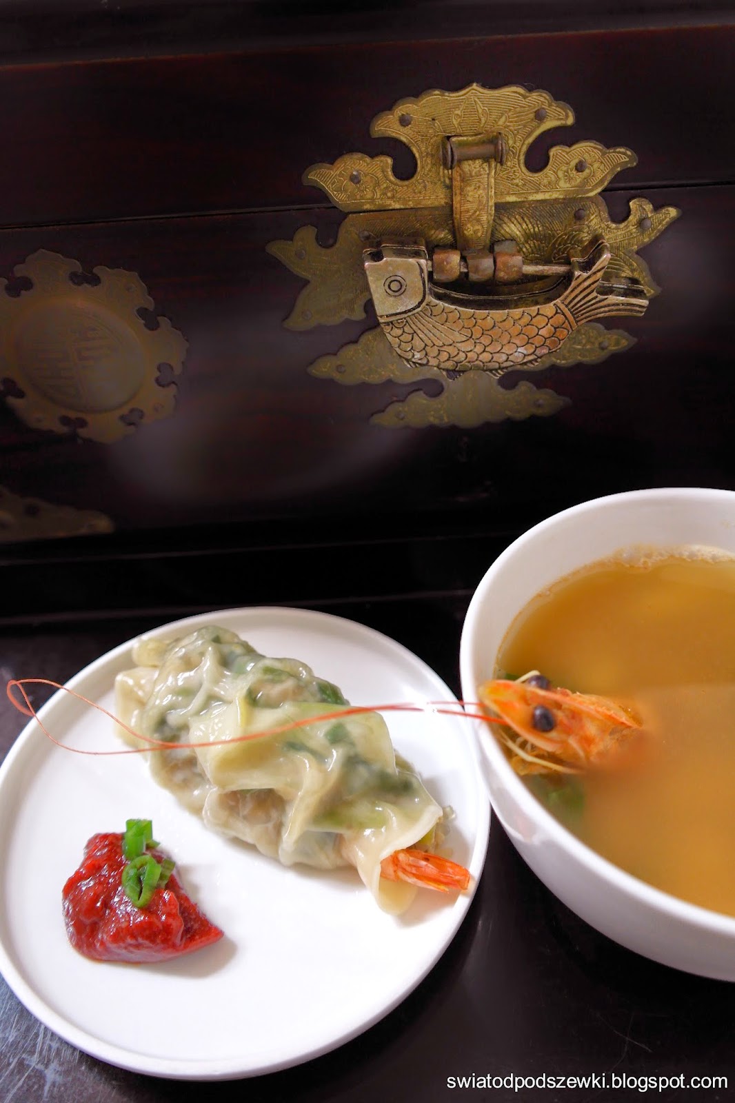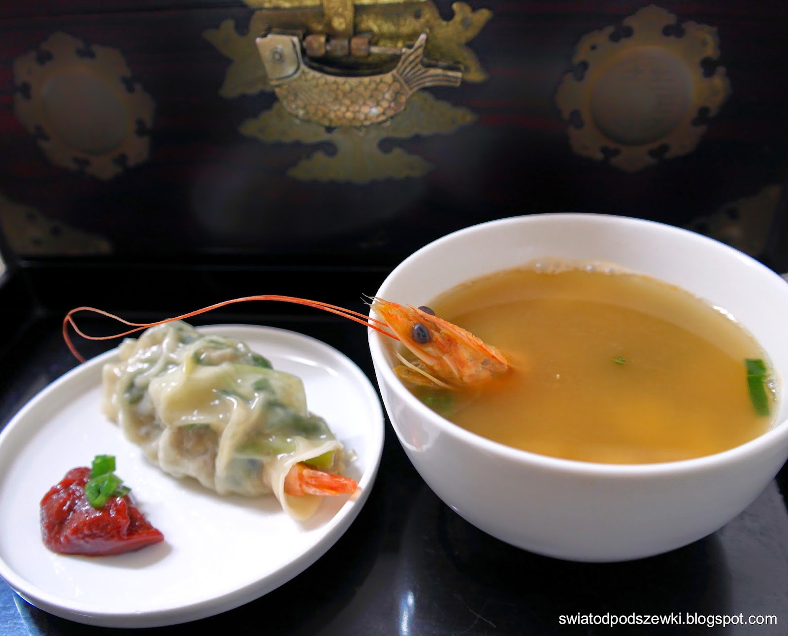 Obok, zagnieciona w krążku pierogowego ciasta, krewetka, z posiekanym czosnkowym szczypiorem, ugotowana na parze. Podczas robienia zdjęć niewdzięcznie cholera wystygła, za karę nabrała rumieńców na patelni. Odsmażanego na chrupko pieroga nikomu chyba nie trzeba reklamować?